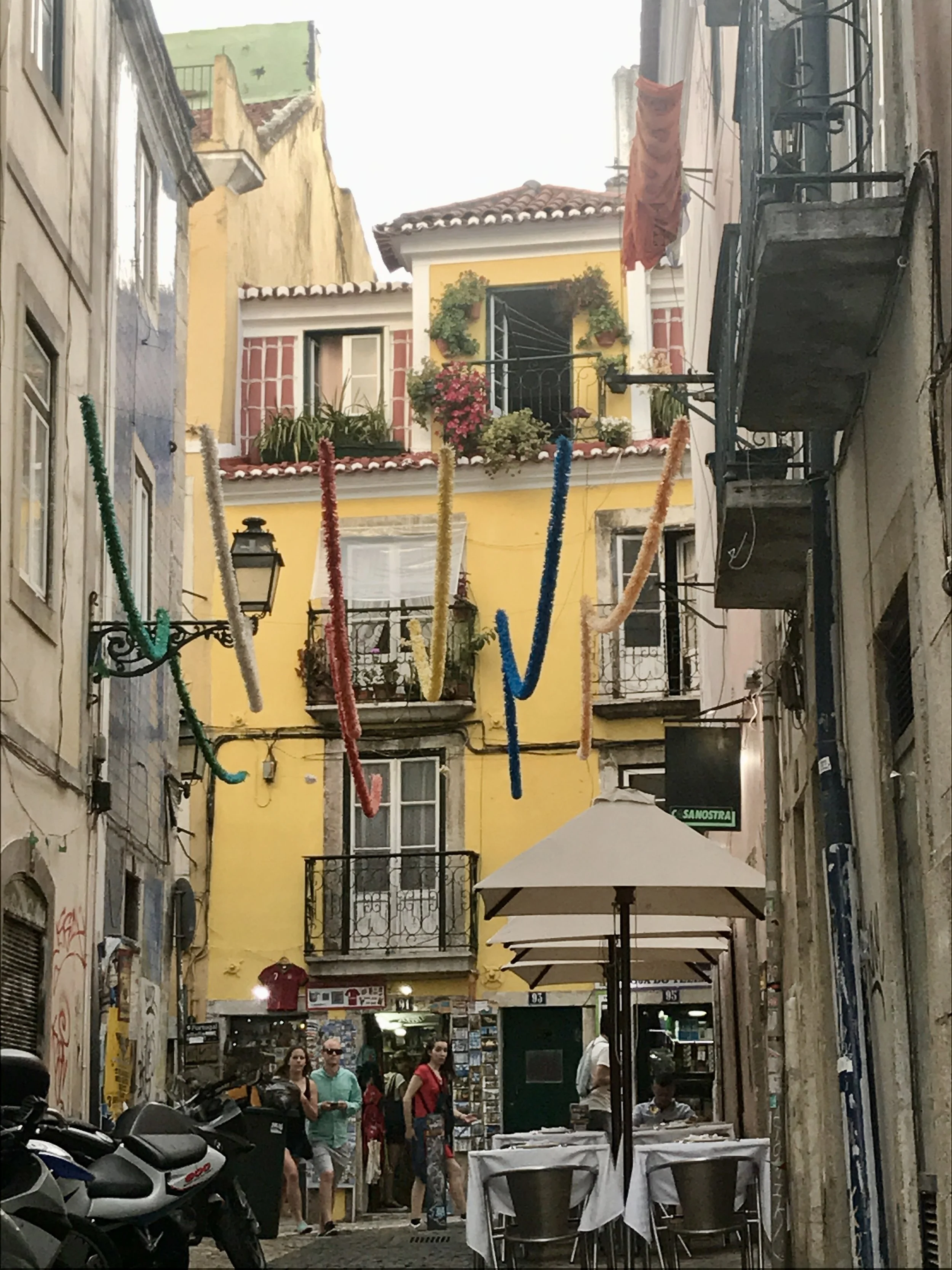 June signals the month-long St. Antony’s Festival in Lisbon. After dinner, Roxy and I wandered through Alfama, Lisbon’s oldest neighborhood, to see, smell, and feel the energy of the neighborhood parties. There was music everywhere, sardines grilling, beer being poured, families and friends celebrating with gusto, and couples being married.