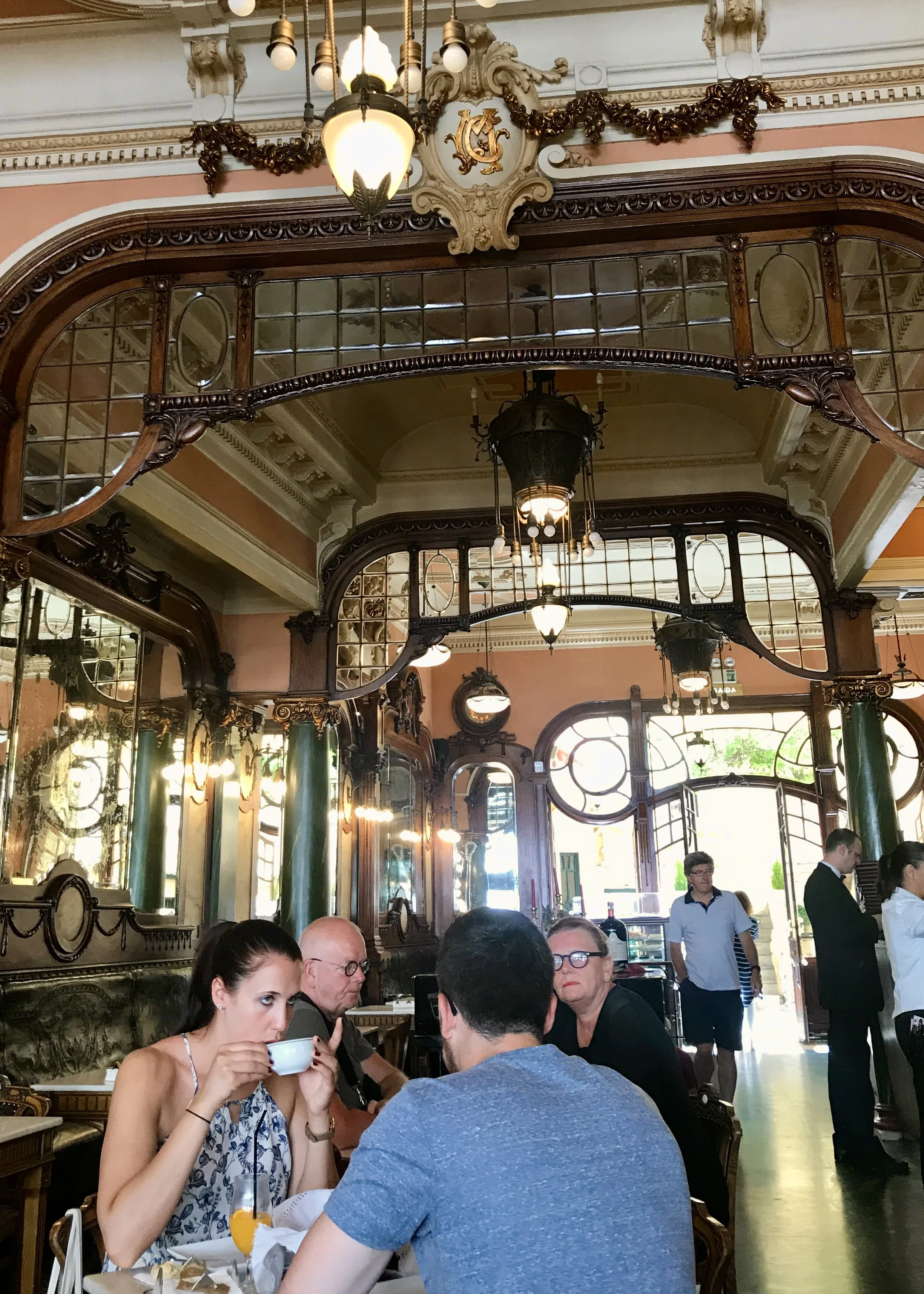 It wasn’t easy to rise from the table after that huge meal, but we managed to make it to the iconic Majestic Café, which is a shimmering icon of Porto. Pedro ushered us to a marble top table and whispered to the waiter, dressed in a black bowtie, vest, and white shirt sleeves, to take care of us. We ordered hot chocolate with whipped cream and tried to imagine what it was like for J.K. Rowling who wrote Harry Potter and the Philosopher’s Stone here, as she’s rumored to have done.